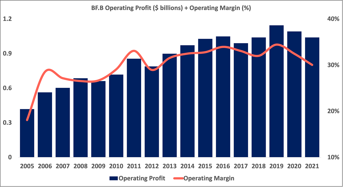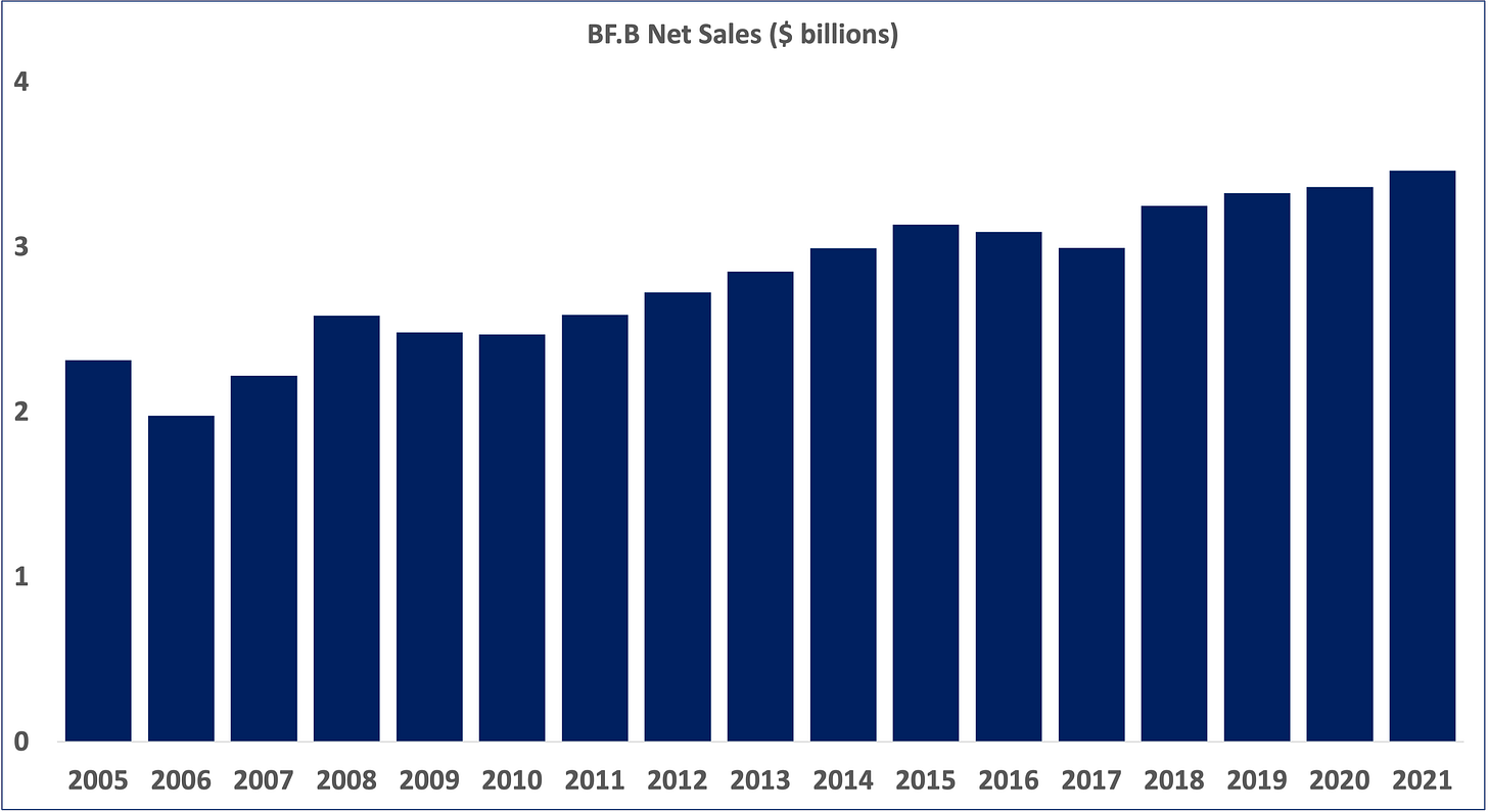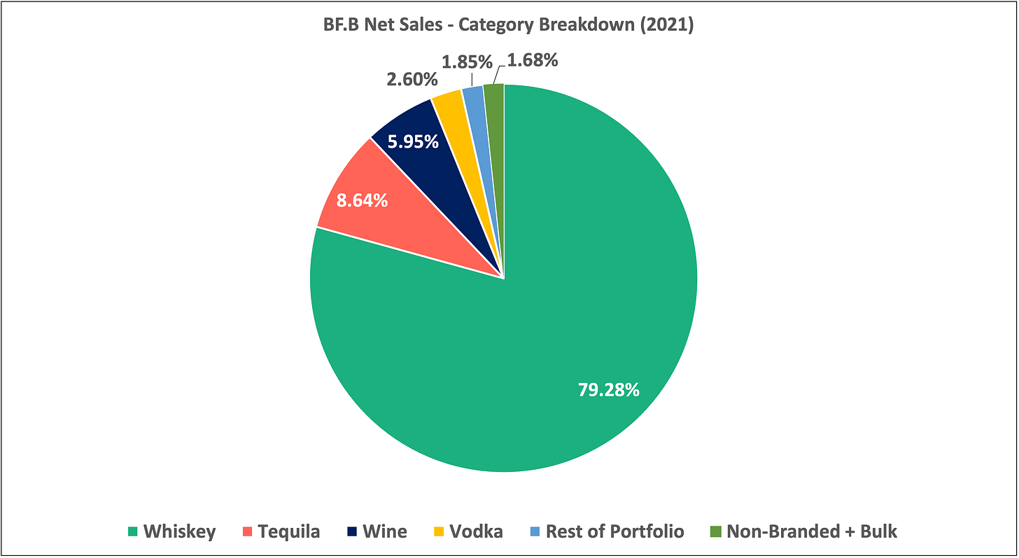 The company has pared down its wine business significantly over the years. In 2008, it sold off its long-held wine business Bolla as well as its Fontana Candida wine brand. And in 2011, it sold its Fetzer Vineyards family of wineries to a wine conglomerate. Most recently in 2020-2021, the company sold a few brands to Sazerac, a company that appears to eat whatever alcohol brands its competitors don’t want. These sales have helped Brown-Forman re-center its business around high-end whiskey supplemented by slices of exposure to high-growth categories like tequila and RTD.