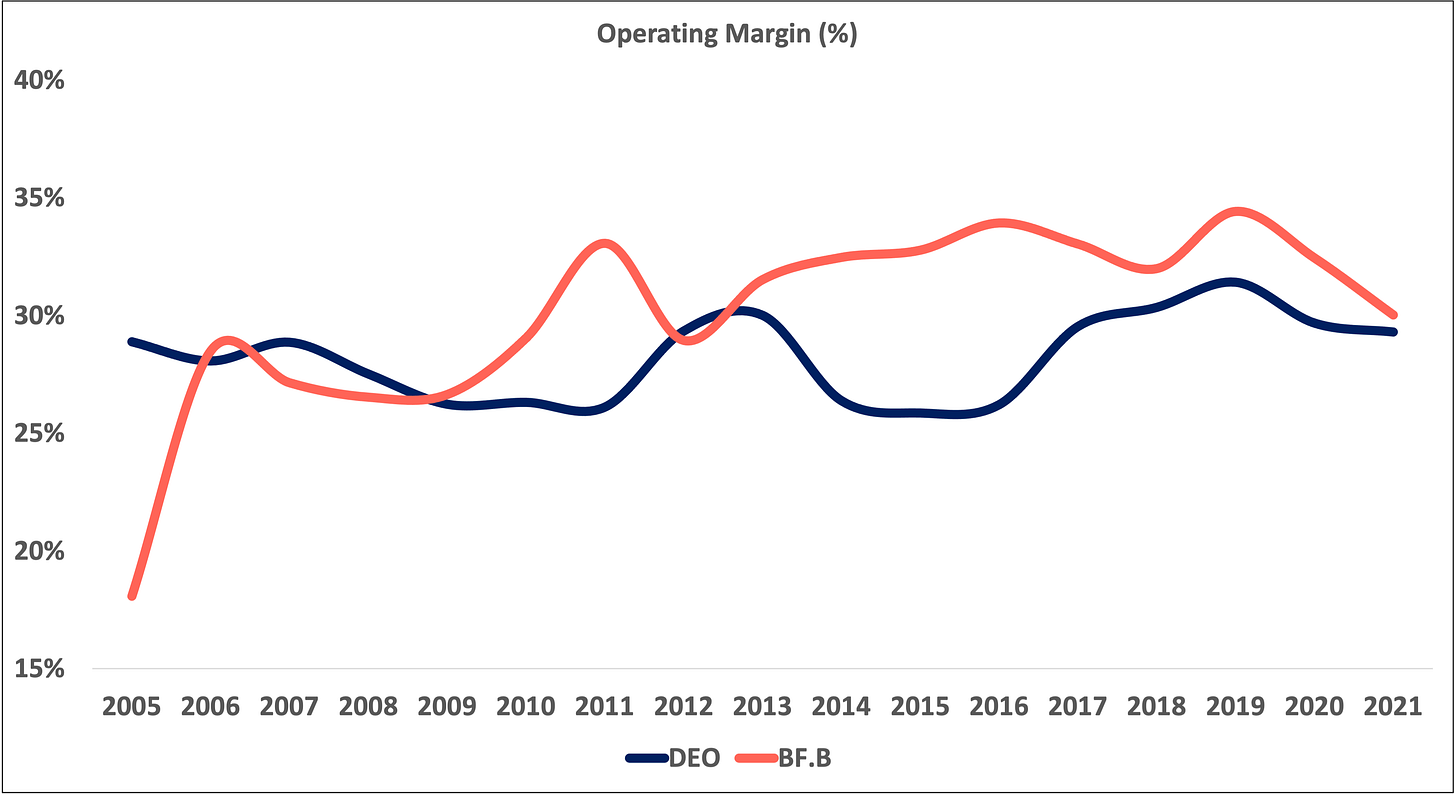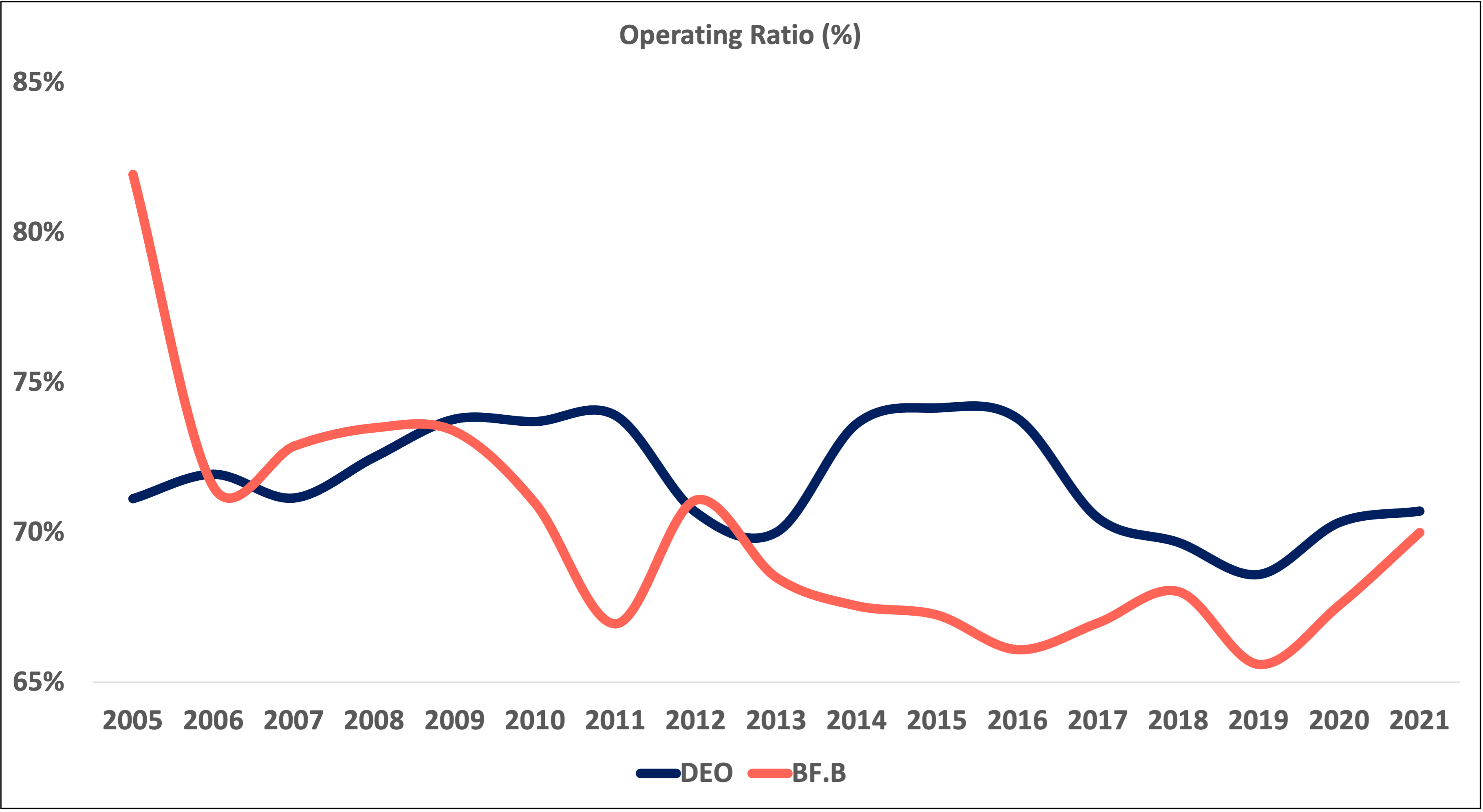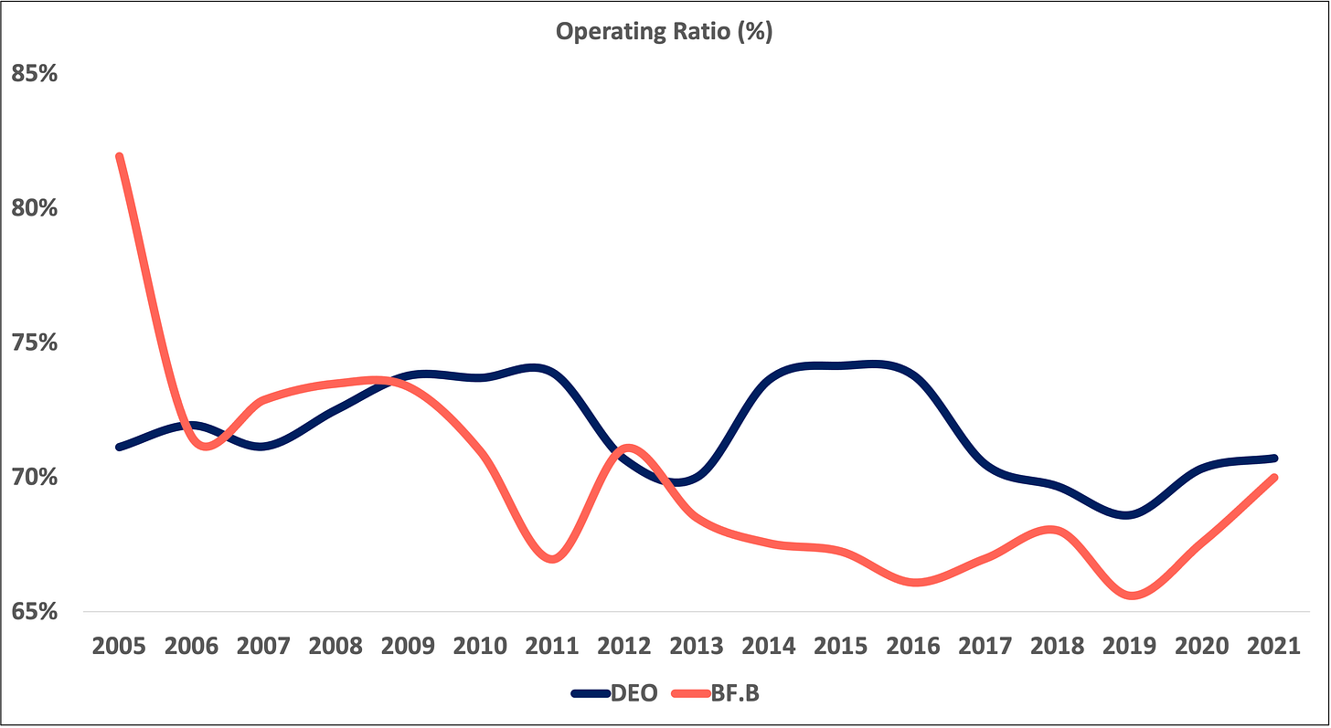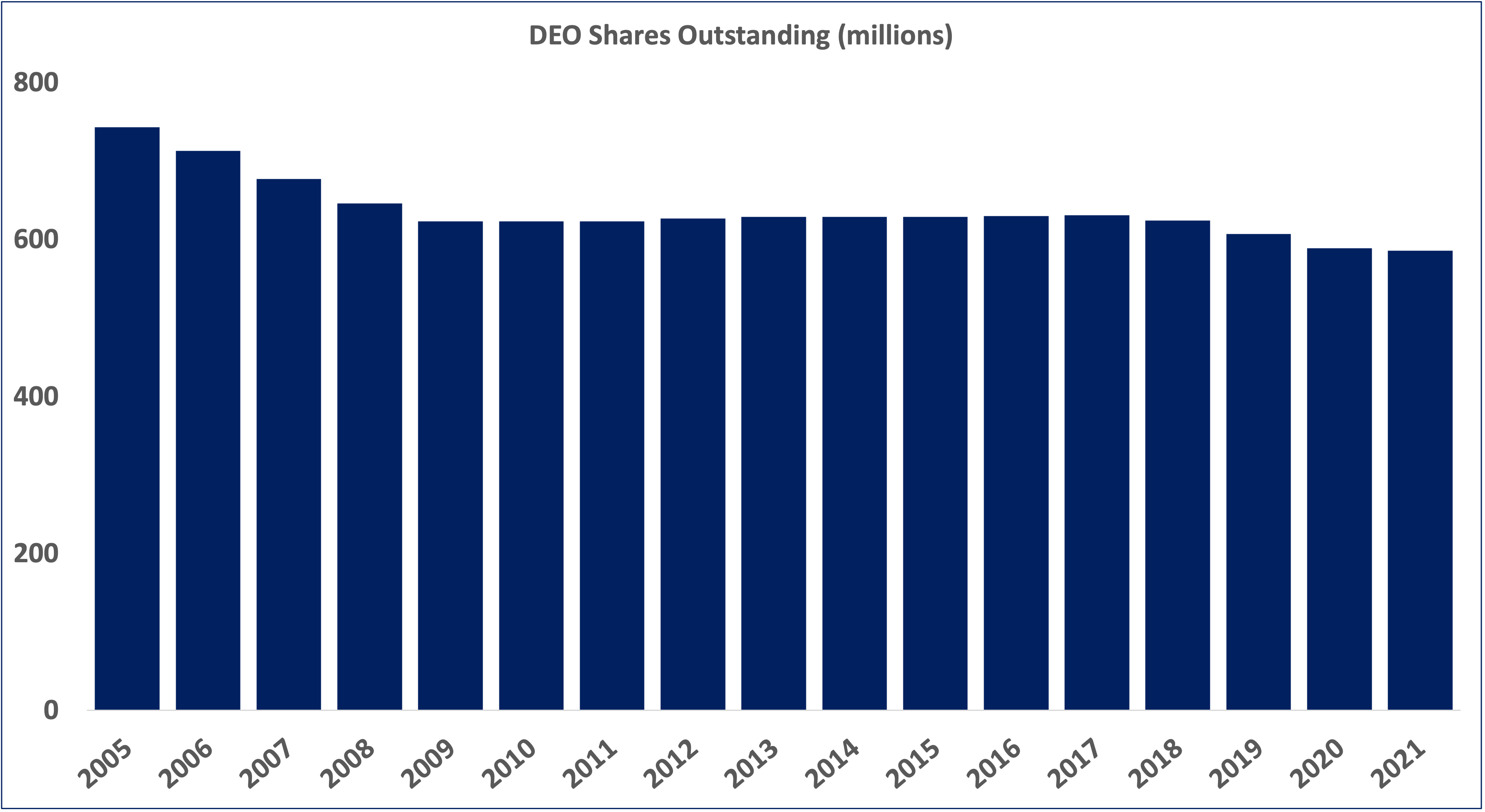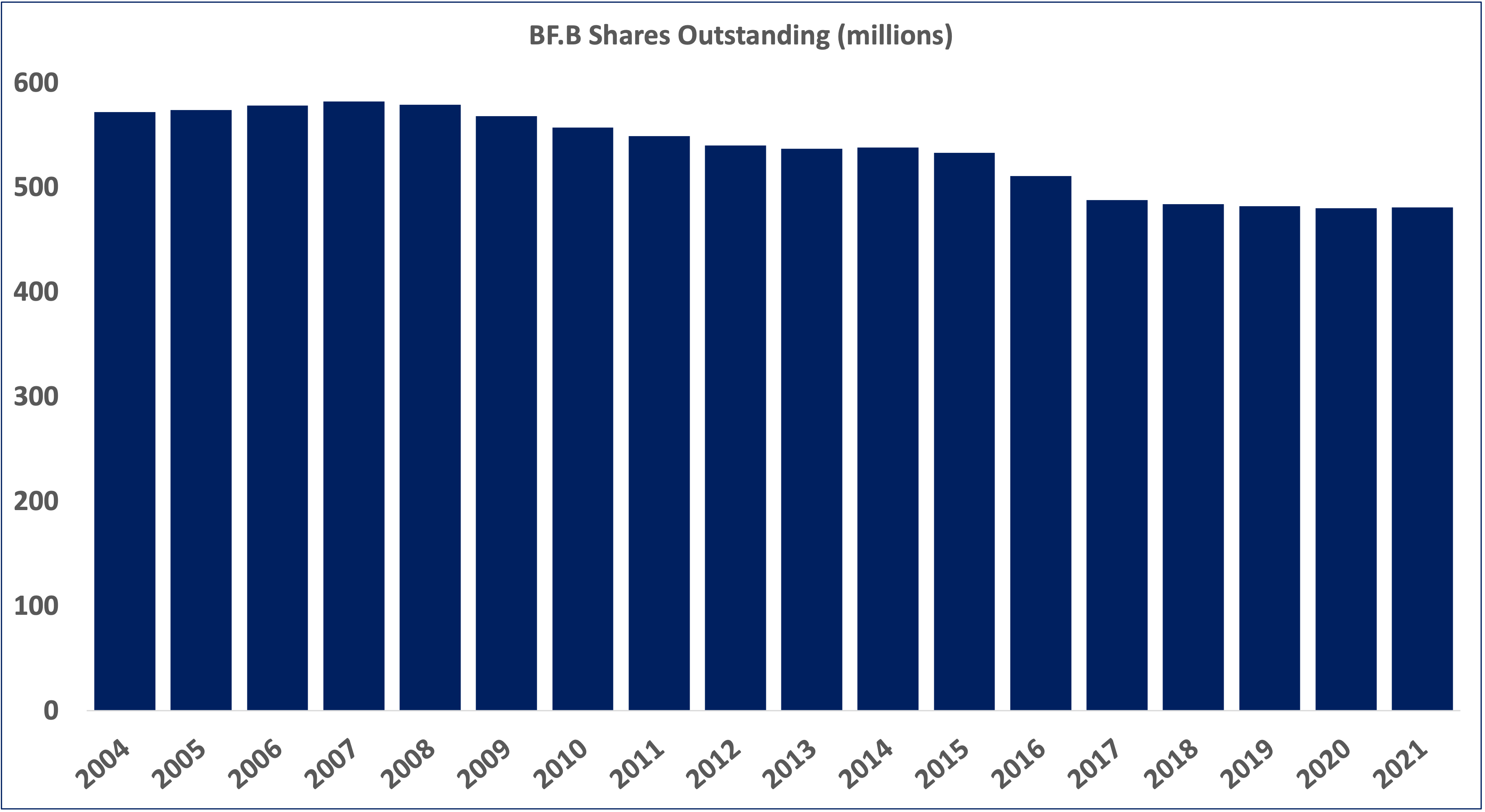 Diageo has reduced its share count by over 21% since 2005 while Brown-Forman has reduced its share count by over 16% over the same time period.