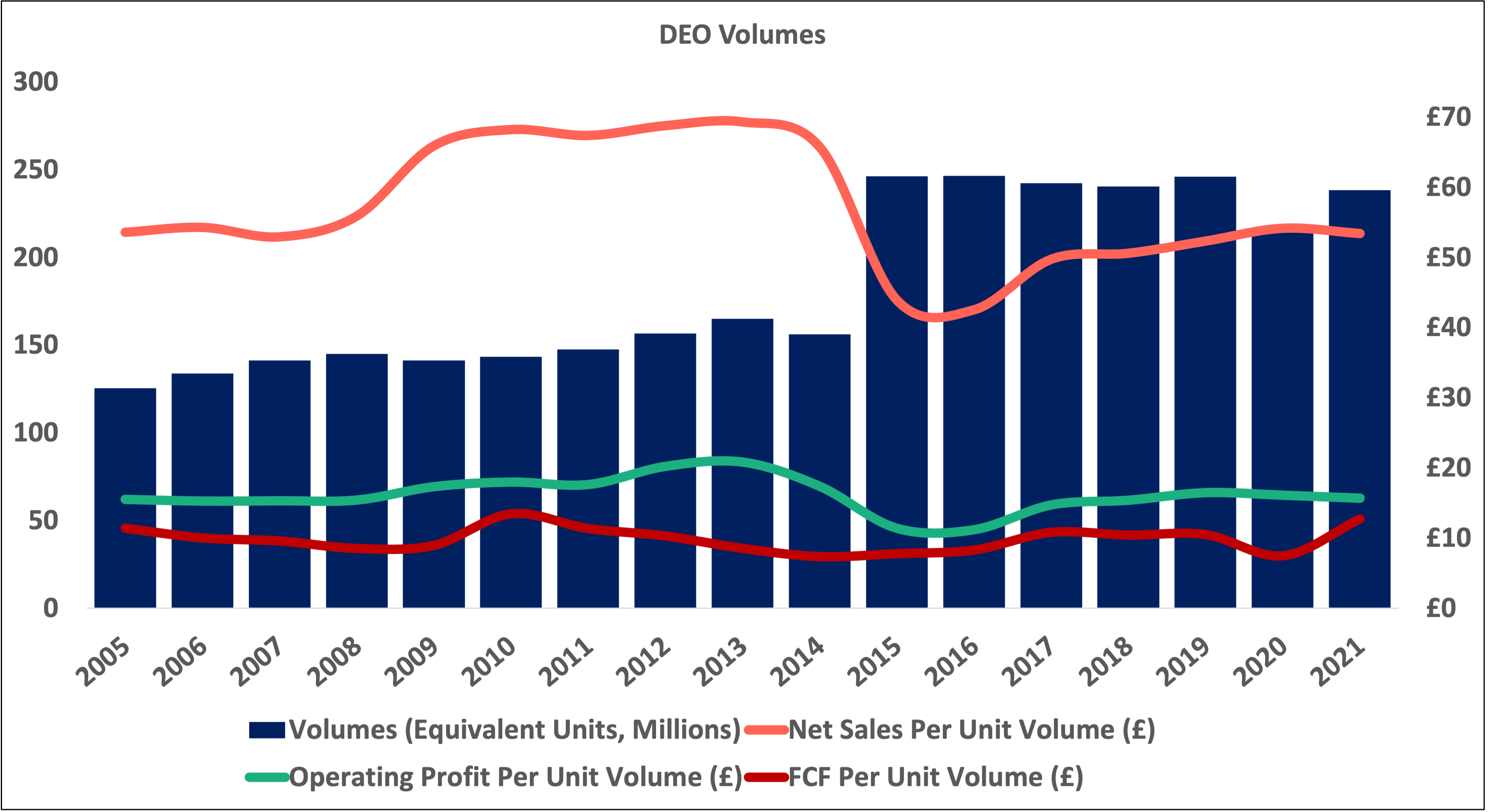 Volumes. Acquisition activity during the 2014-2015 period led to a big jump in volumes. Net sales and operating profit per unit volume dropped, however, likely due to an increase in the proportion of total volumes sold in countries with weaker currencies relative to the pound. The acquisition of a controlling stake in United Spirits Limited in India during the 2014-2015 period was likely the culprit.