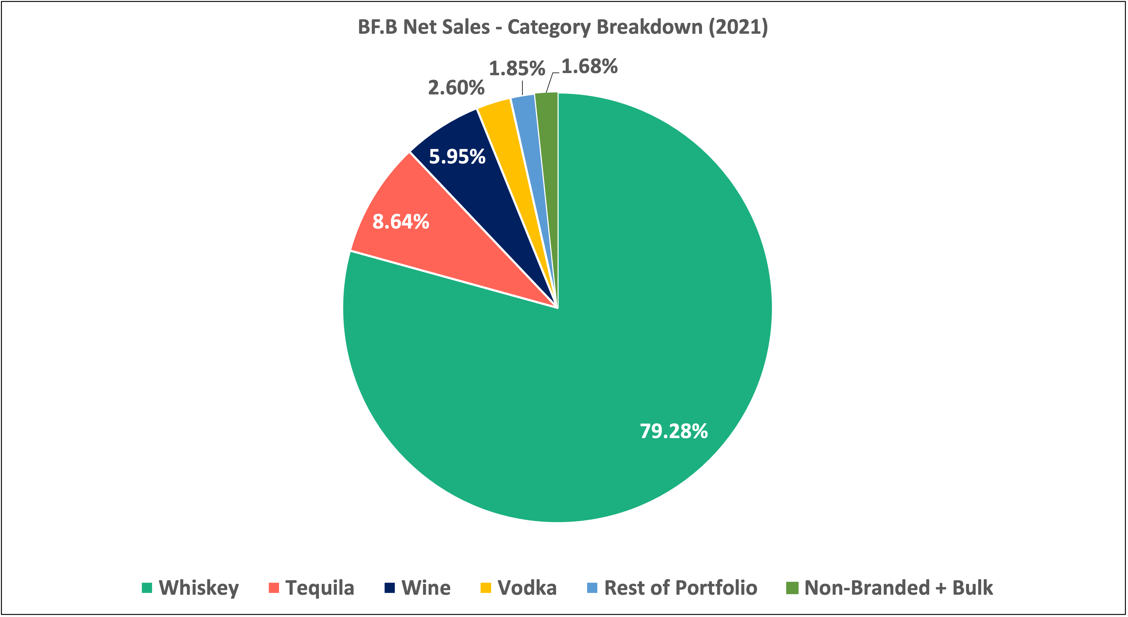 Brands. Brown-Forman’s is largely a whiskey company. The company’s flagship brands are Jack Daniel’s Tennessee Whiskey (JDTW) and Woodford Reserve. The company’s whiskey portfolio is responsible for almost 80% of net sales. Its tequila portfolio consisting of five tequila brands is responsible for just under 11% of net sales. Its two wine brands bring in over 7% of net sales, and its vodka business (Finlandia) accounts for just over 3% of net sales (down from nearly 5% in 2019). Since 2019, vodka net sales are down while whiskey, tequila, and wine are up. In total, the company holds around forty brands, many of which are sub-brands (for example, there are twelve separate brands under the Jack Daniel’s umbrella and five in the Woodford Reserve family). Excluding these sub-brands, the company has closer to twelve primary brands.