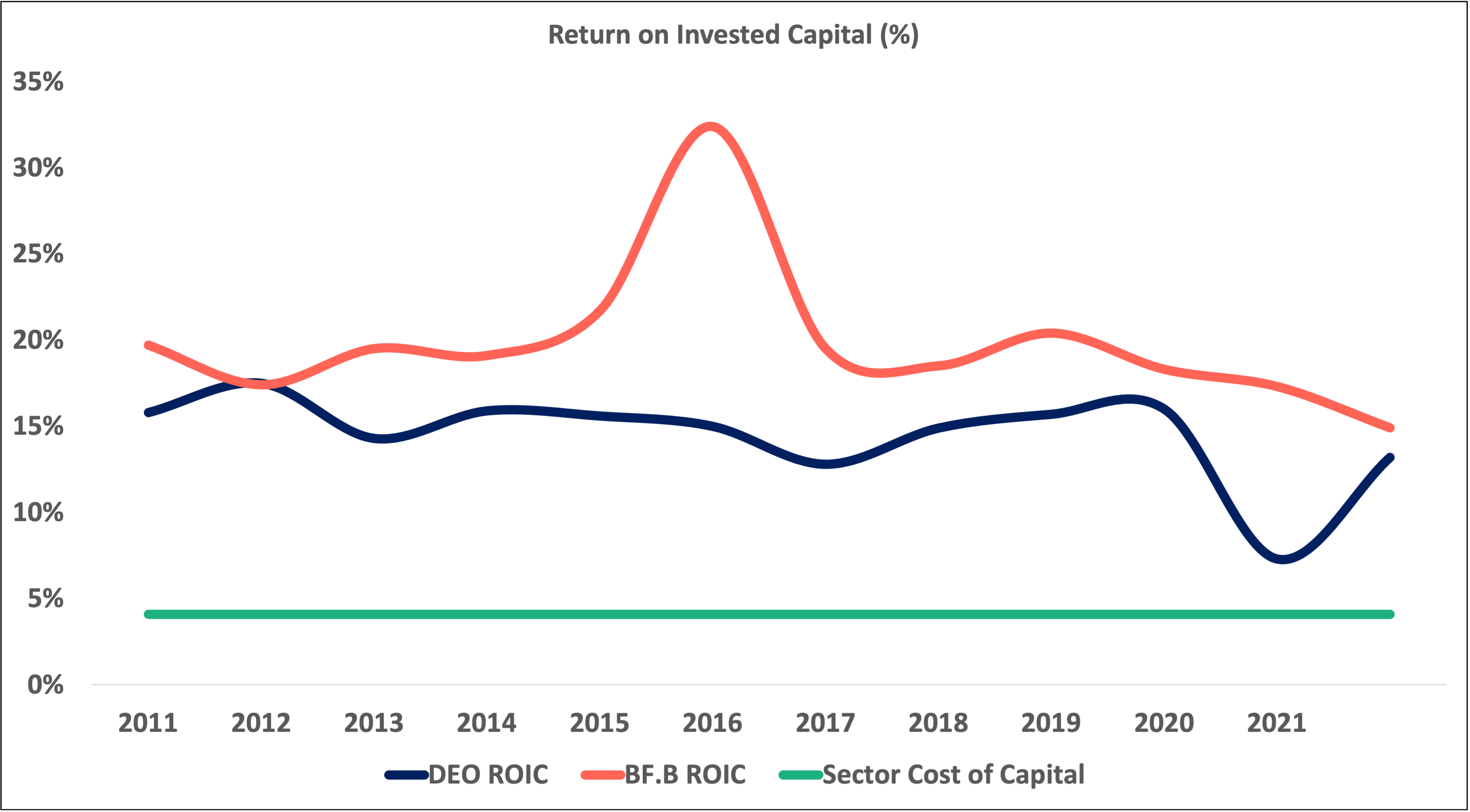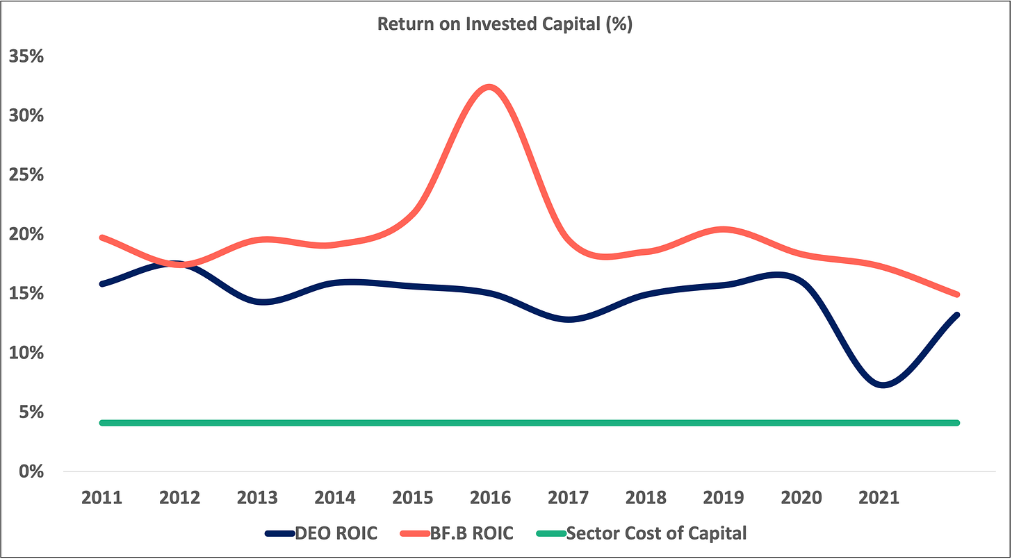 If it isn’t obvious by this point, both companies have wide moats thanks to their brands. High end alcohol brands are insulated from private label threats and benefit from consumers using them not only for personal consumption but also as signals of status. High end alcohol brands create a sense of luxury when being ordered, displayed in bottles, and consumed, especially in front of others. Furthermore, high end alcohol brands are on the more affordable end of the luxury goods spectrum. Most of us can’t afford Ferraris or Birkin bags, but many of us can stretch our wallets for a bottle of Johnnie Walker or a shot of Casamigos. Thus, accessible luxury is an important component of these companies’ brand-centered moats.
