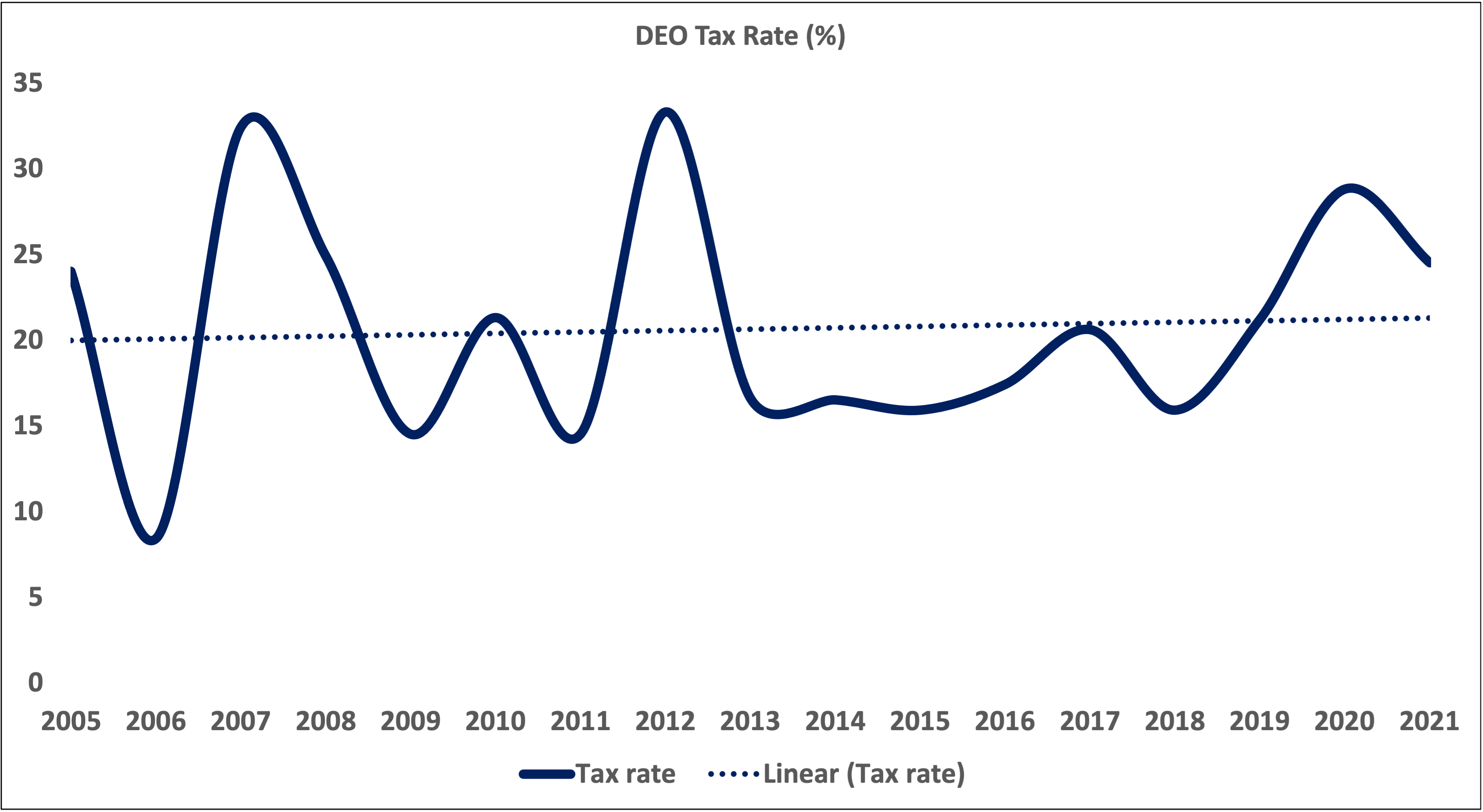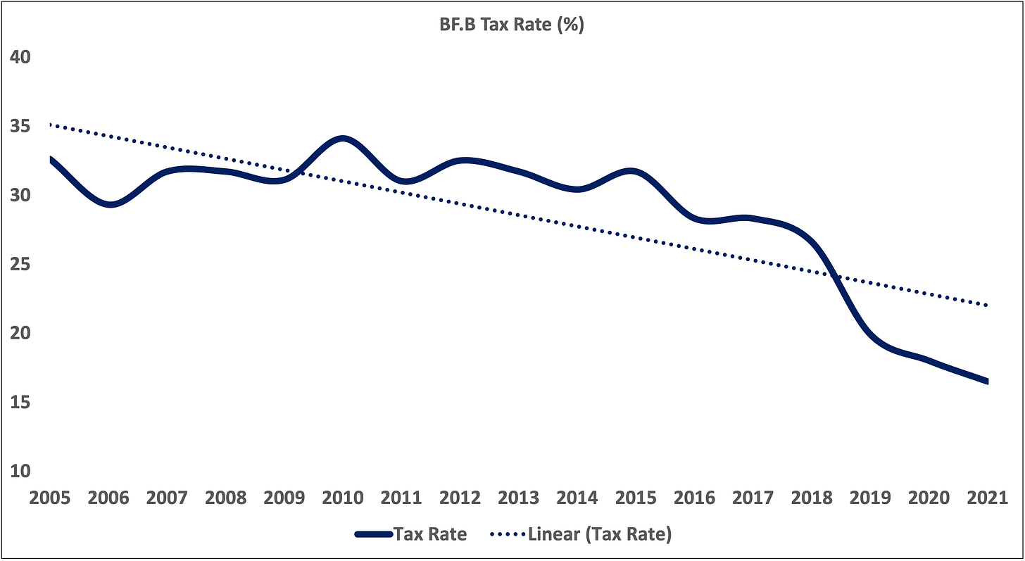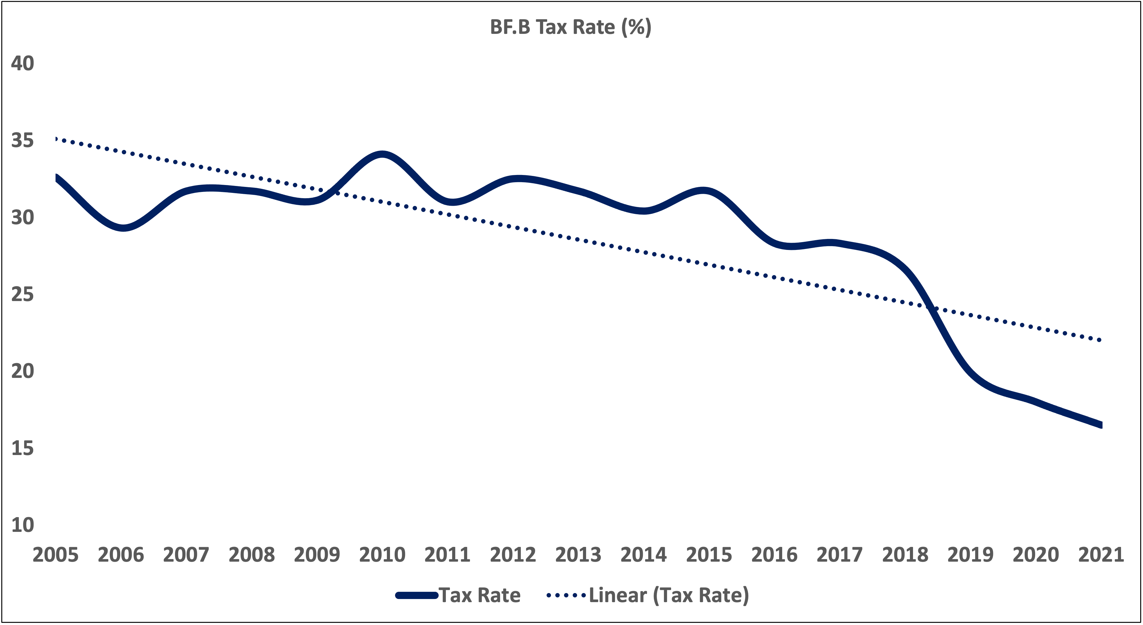 Taxes. Diageo has posted a 20.6% average effective tax rate since 2005. Brown-Forman has posted an average of 28.6% over the same period. Both are trending around 20%. The average money-making alcoholic beverages company in the U.S. pays an effective tax rate of 18.36%.