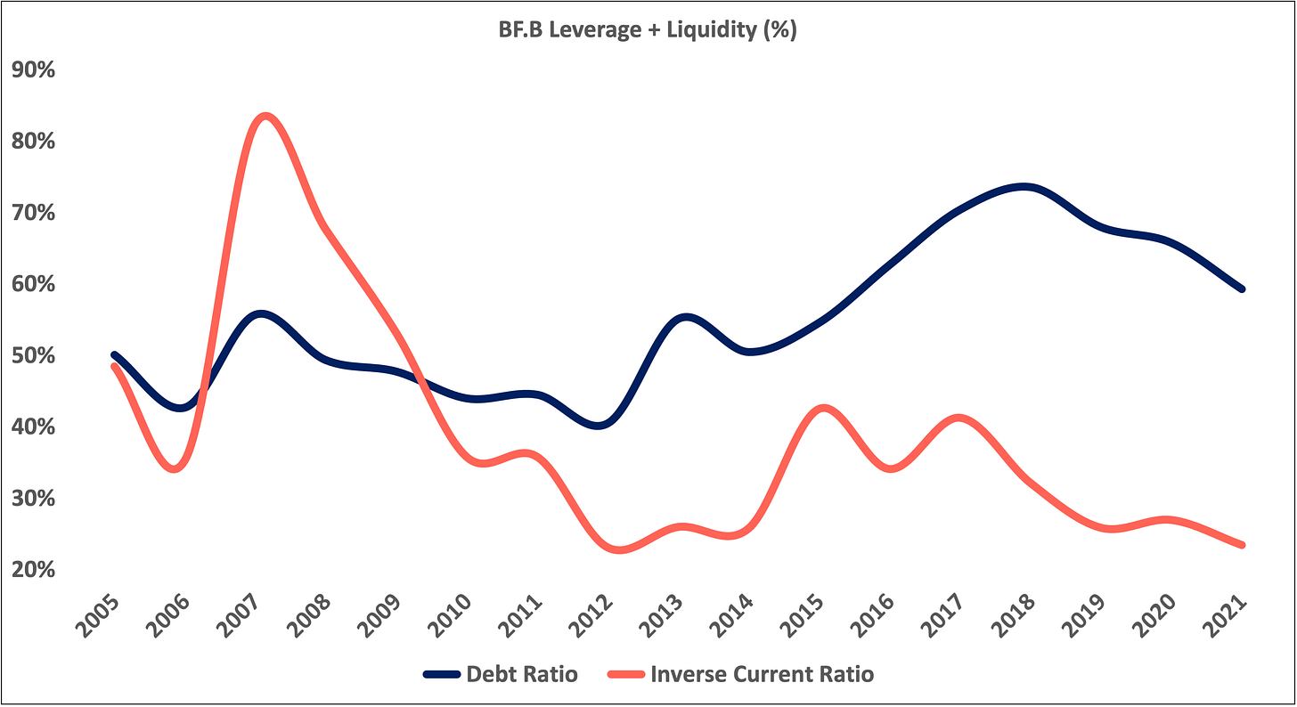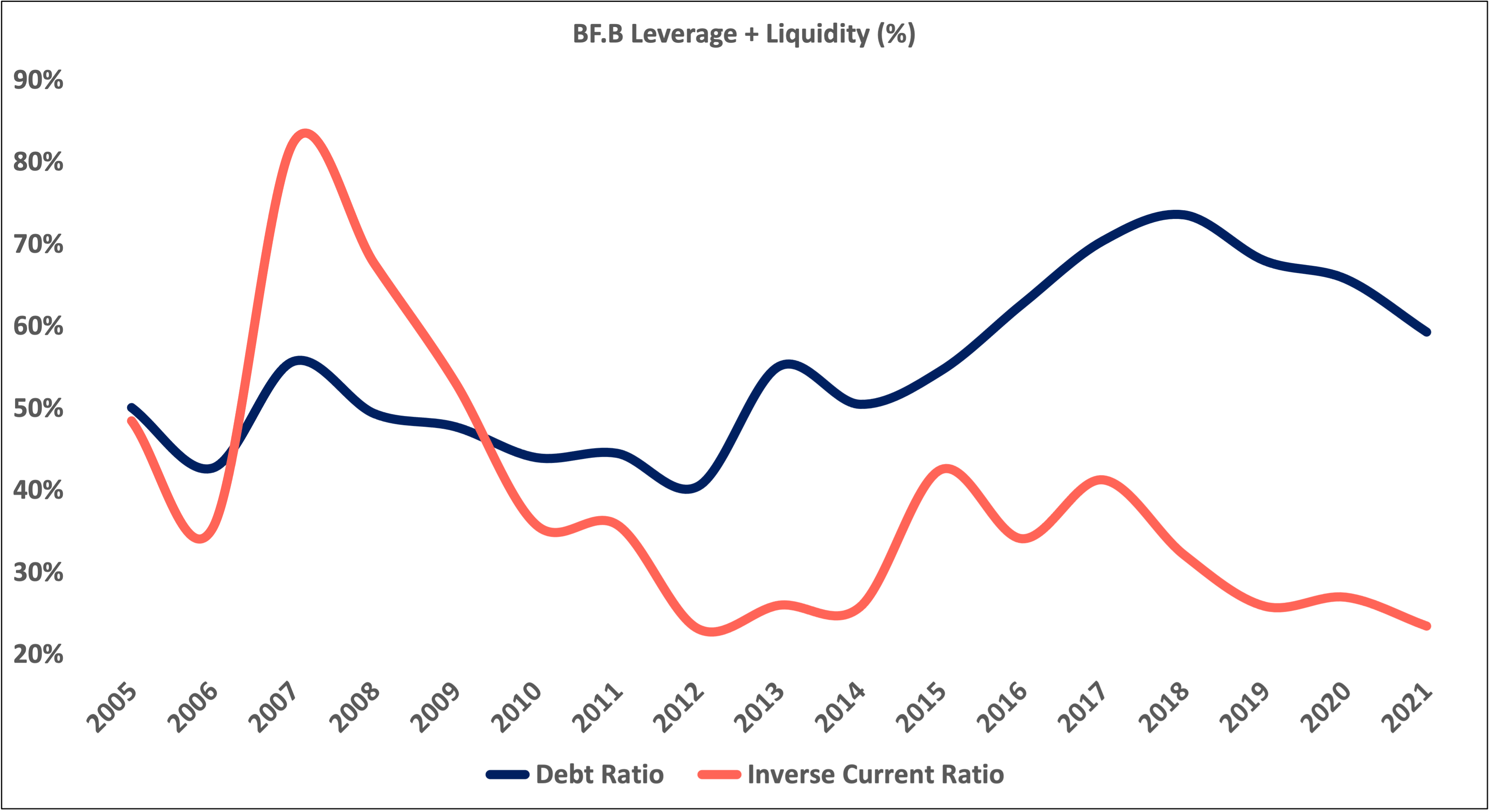 Leverage + liquidity. Since 2010, management has been able to keep current liabilities as a percent of current assets low relative to the company’s debt ratio (total debt / total assets).