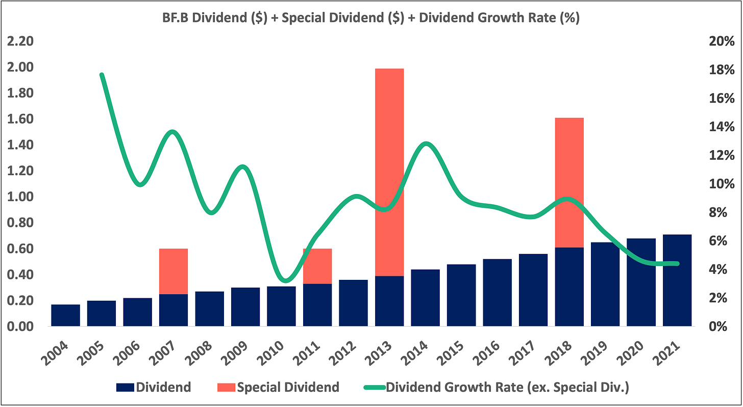 Capital allocation. Brown-Forman has paid a dividend since the 1940s and has raised its dividend each year since the 1980s. The company does issue substantial special dividends from time to time. Since 2004, the dividend’s average annual growth rate (excluding special dividends) has been 8.83%.