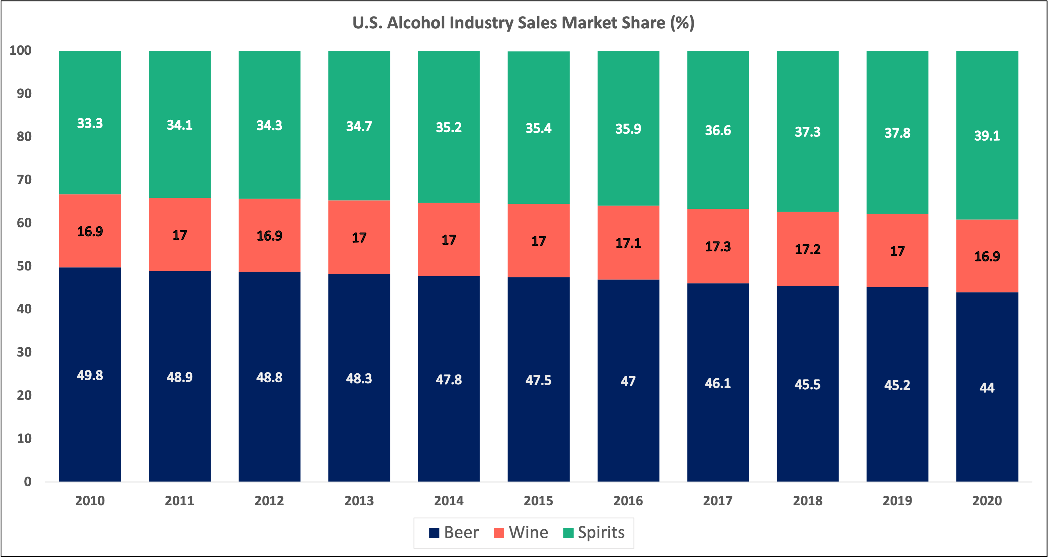 From 2010 to 2020, the beer category in the U.S. has been losing market share to spirits. Beer has dropped from close to 50% of alcohol sales to 44%. Spirits have grown from 33.3% of the market to almost 40%. And wine has held steady at around 17%.
