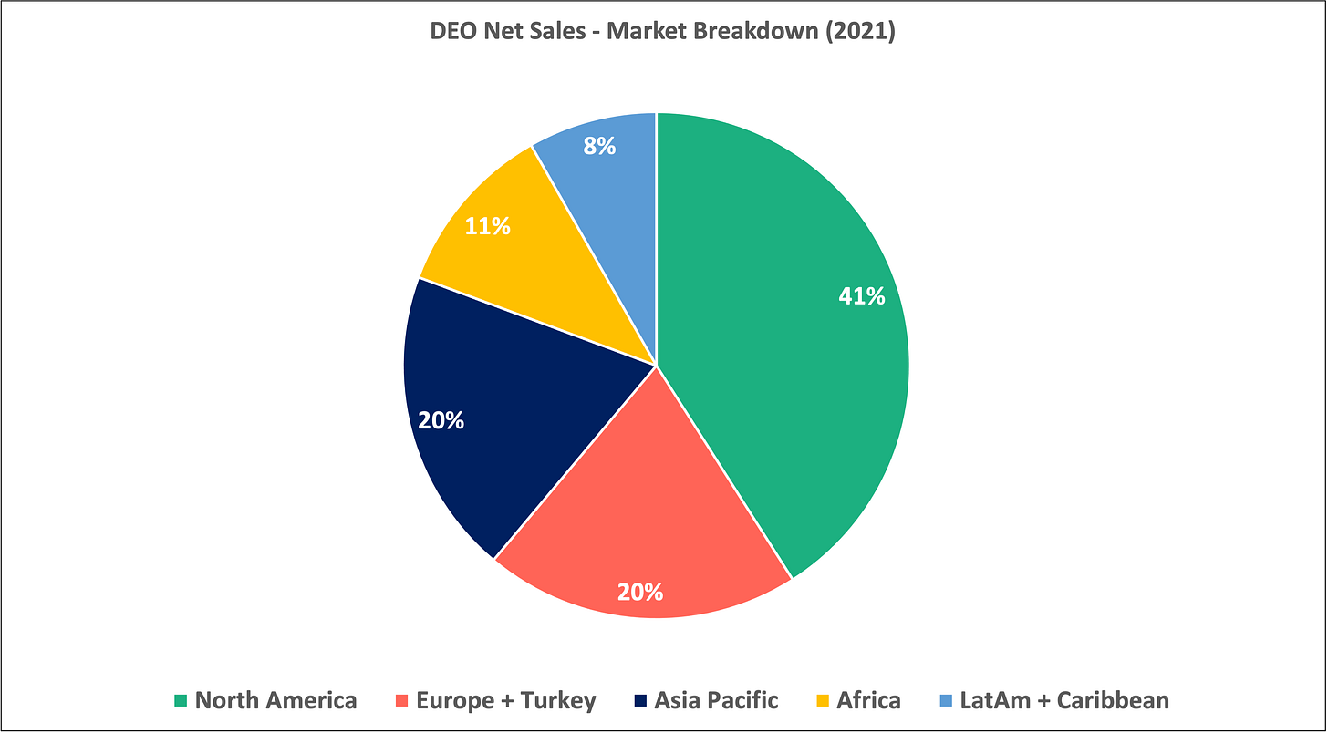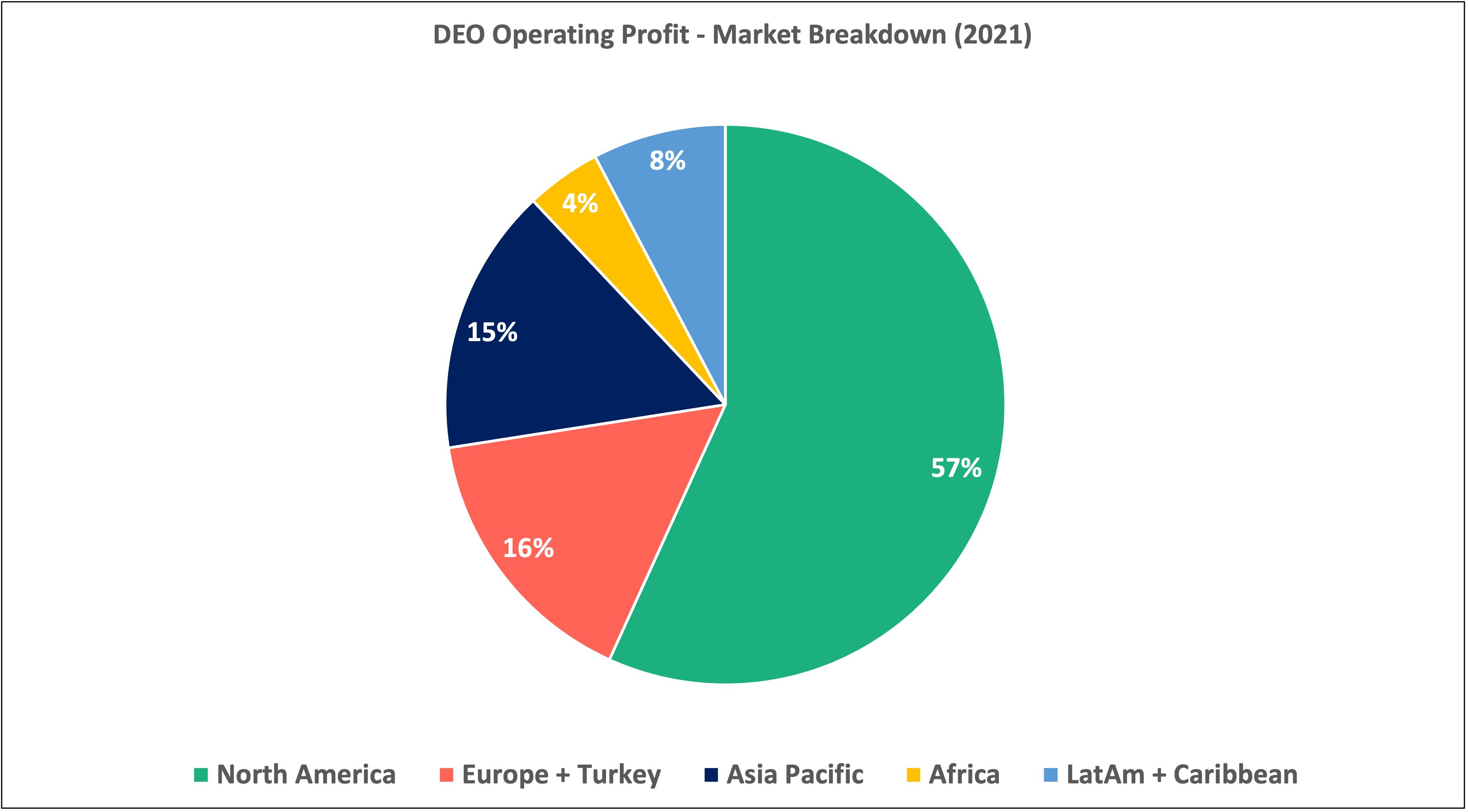 International reach. Diageo functions very much as a world index of premium and popular alcohol brands. North America (its largest market) brings in 41% of its sales, while Europe and Turkey, Asia Pacific, Africa, and LatAm and Caribbean bring in 20%, 20%, 11%, and 8%, respectively.