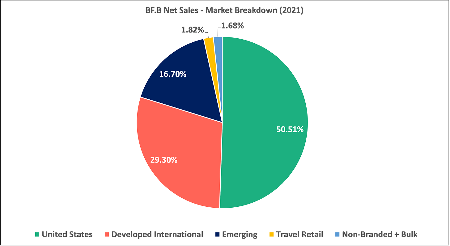 Markets. Brown-Forman breaks down its markets into three groups: (1) the United States; (2) developed international (Australia, Germany, the U.K., France, etc.); and (3) emerging (Mexico, Poland, Brazil, Russia, etc.). The U.S. accounts for half of all net sales. Developed international accounts for 29%. Emerging accounts for 17%. And the remaining share of net sales come from travel retail and bulk/non-branded net sales.
