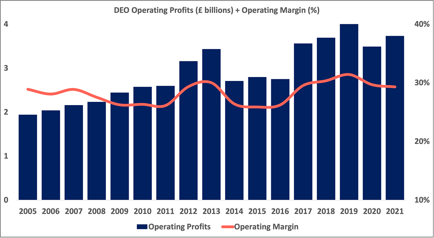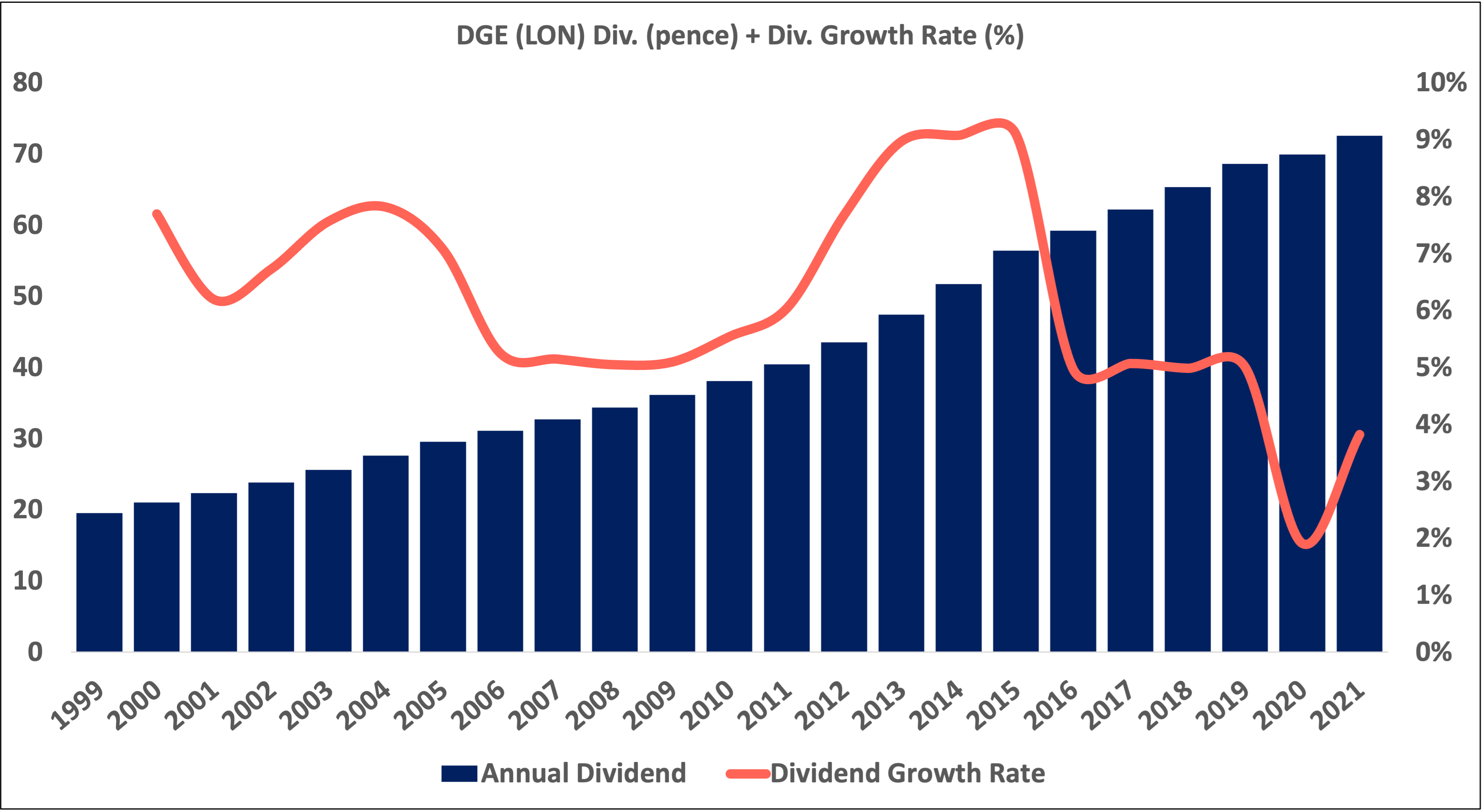 Capital allocation. Diageo targets a ratio of earnings-(excluding exceptional items)-to-dividend of between 1.8 and 2.2 times. The company’s payout in pence (via the DGE shares) has been growing uninterrupted for over two decades. Those holding U.S.-listed shares (DEO) have experienced choppy dividend payouts due to changes in the pound-to-dollar exchange rate over the years. Even so, holders of DEO have also enjoyed healthy dividend growth over the last two decades. Since 2004, the dividend’s average annual growth rate has been 5.97% if you owned the London shares (DGE) and 5.27% if you owned the U.S. shares (DEO).