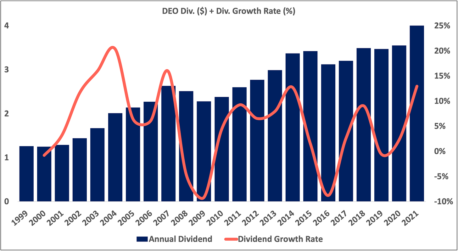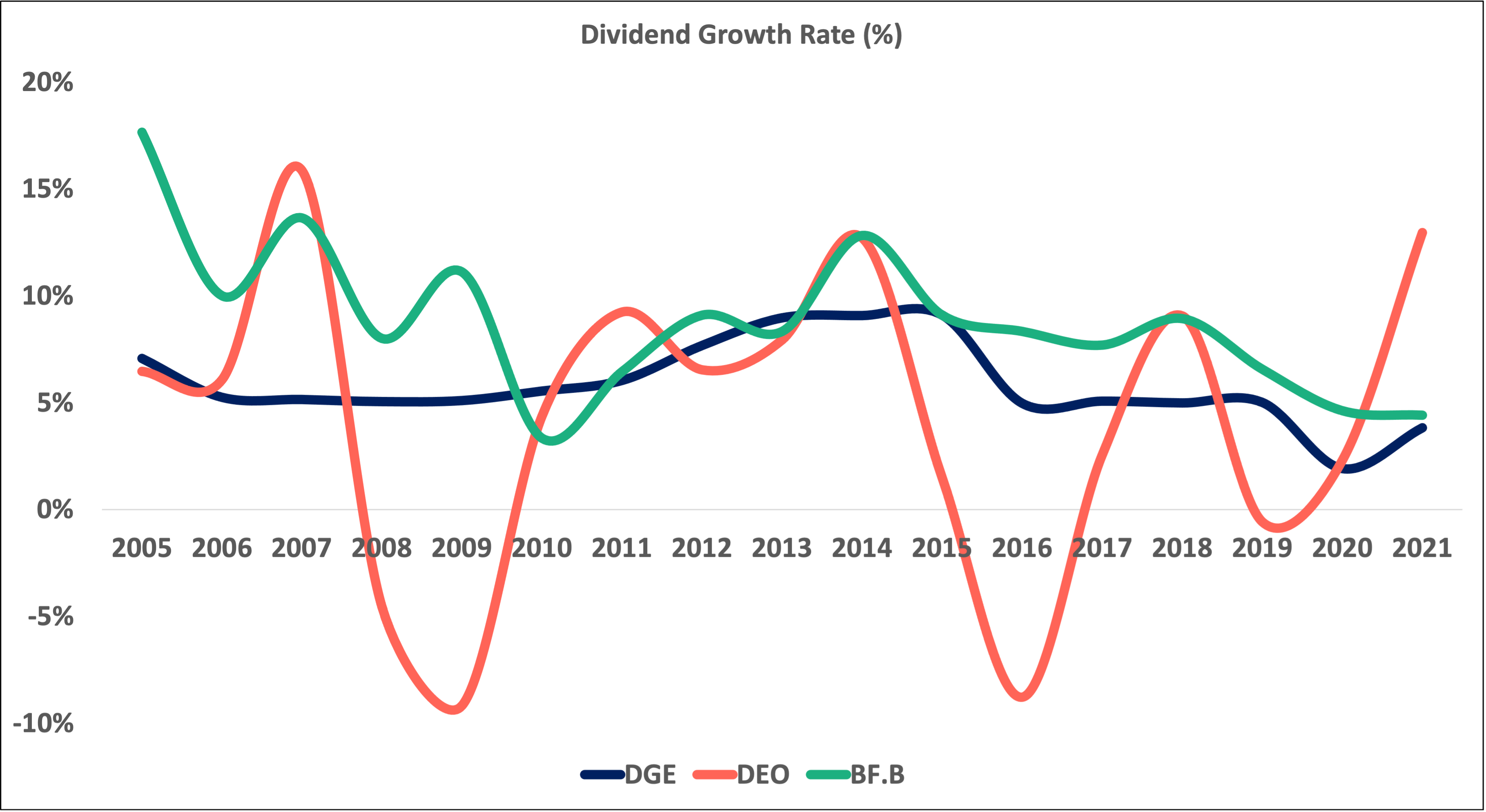 Shareholder friendliness. Diageo’s (via DGE, paid in pence) and Brown-Forman’s dividend growth rates have been trending down in recent years. If you bought DEO (paid in dollars), the growth of your dividend payment has been much more variable thanks to the pound-to-dollar exchange rate.