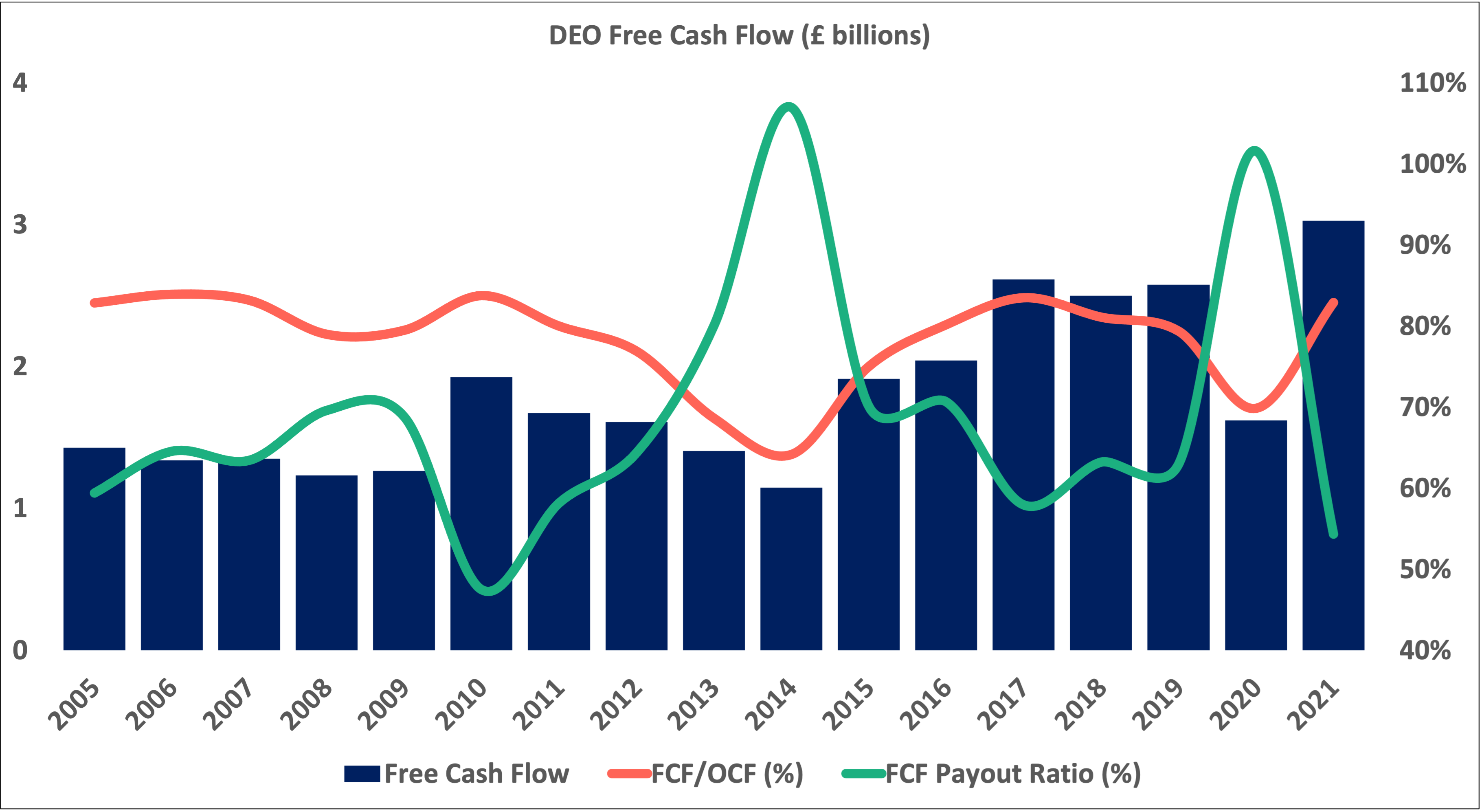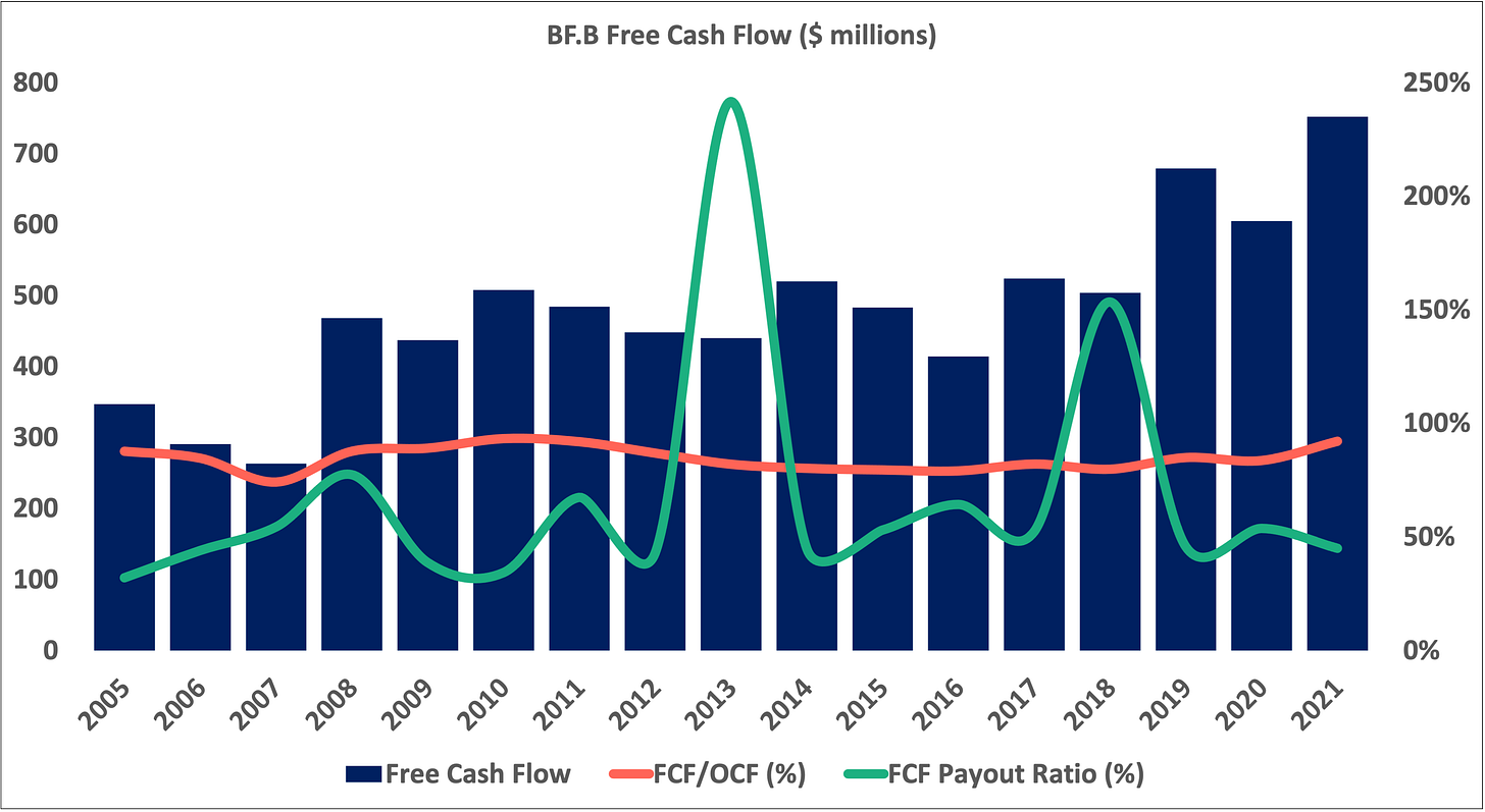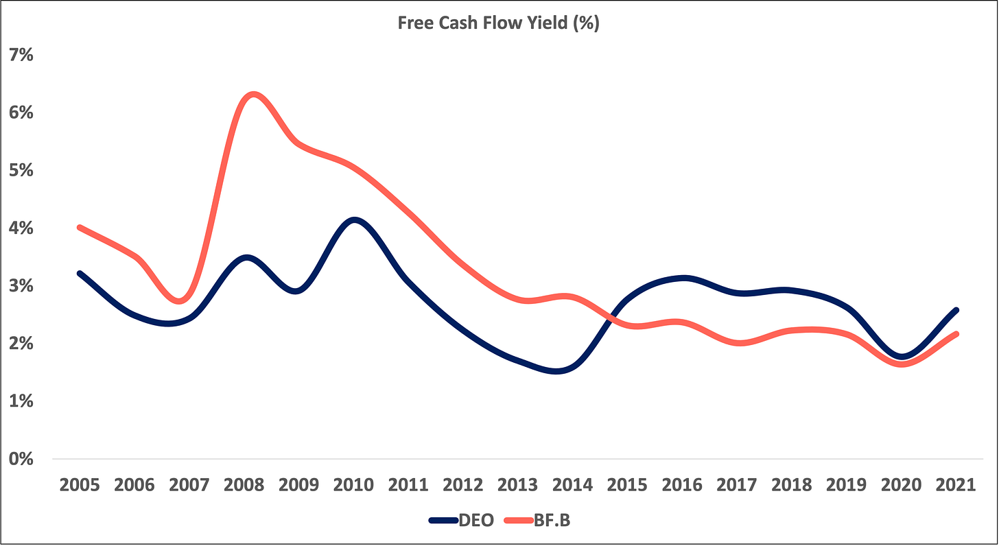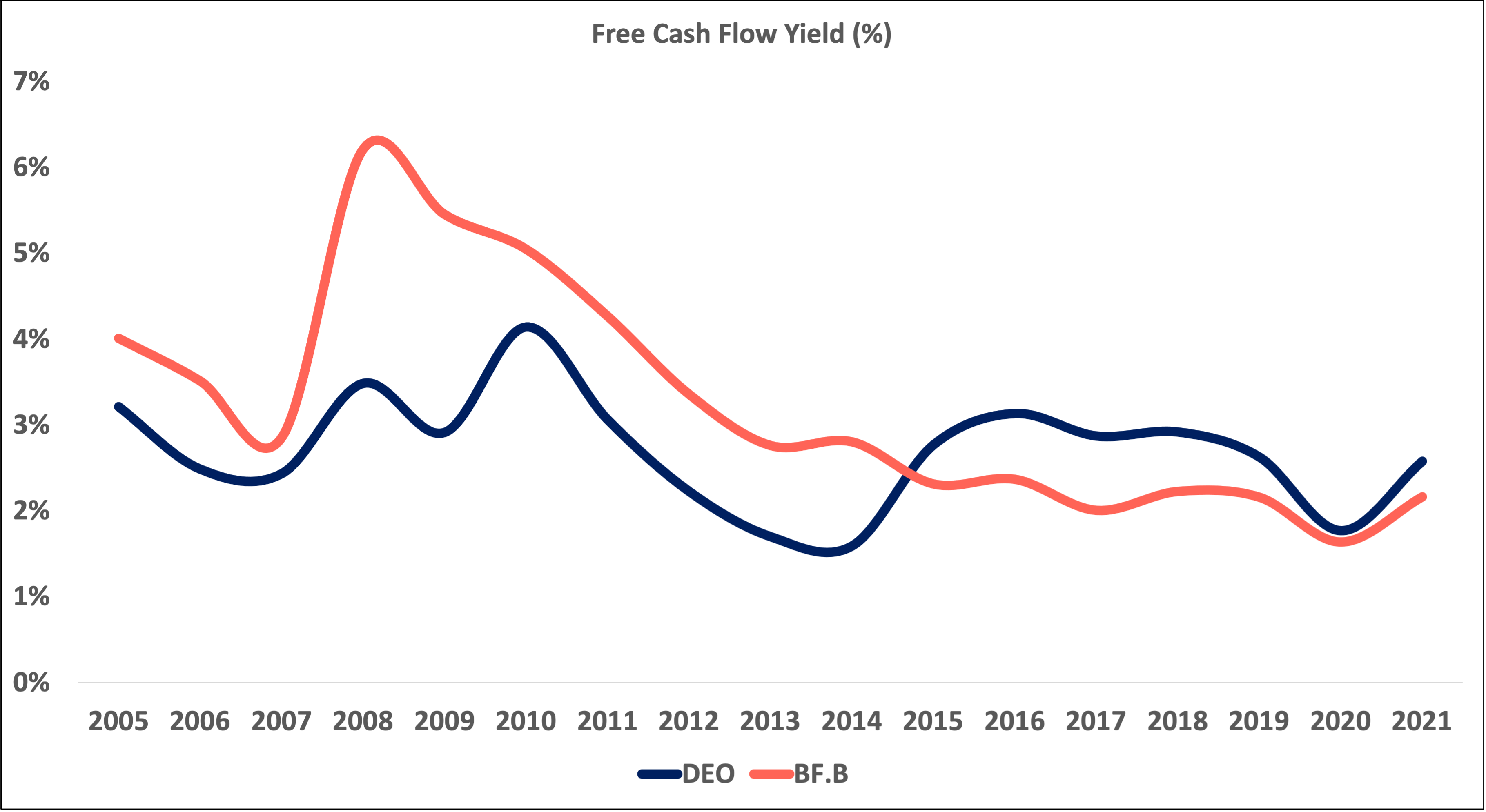 Both companies have more than doubled their free cash flow, respectively, since 2005 (112% increase for Diageo and 116% for Brown-Forman).