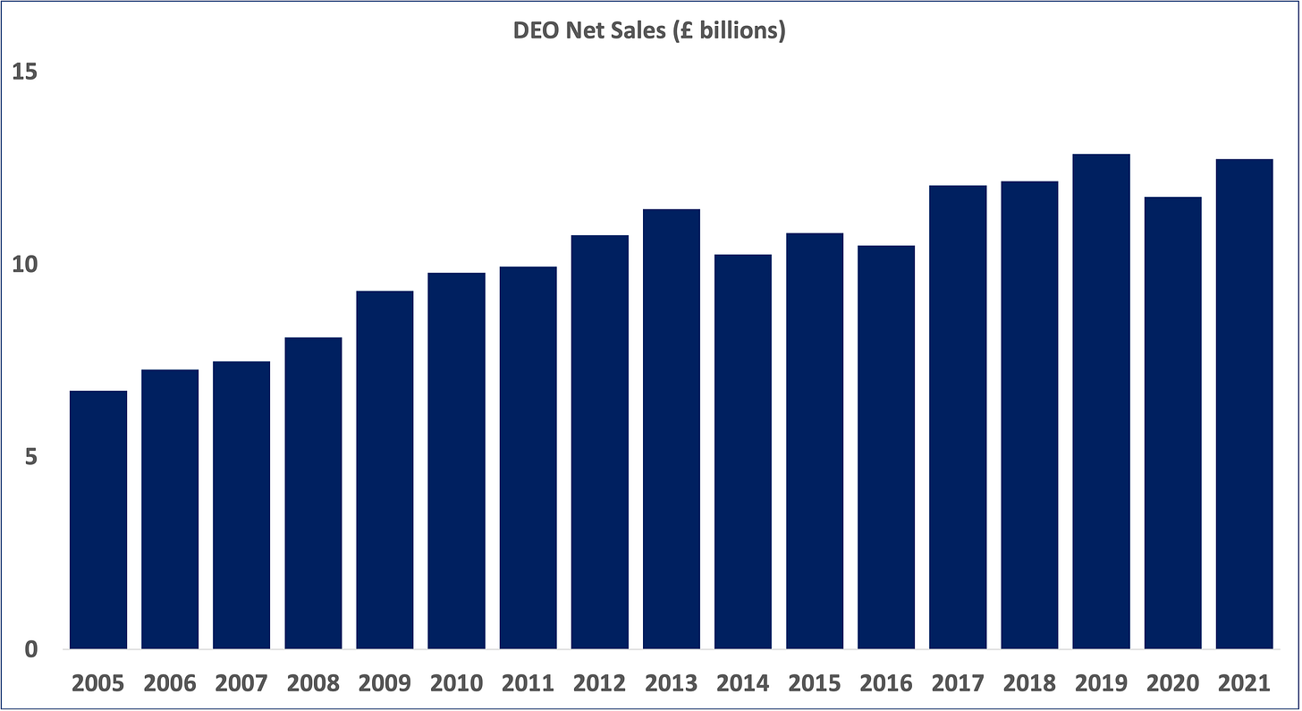 Diageo has not been sleeping on e-commerce. Its products dominate Drizly’s (an alcohol delivery business owned by Uber) top-selling brands. The company owns five of the top ten spirits brands sold on the platform, including two of the top three. And on China’s largest platform, T-Mall, Diageo is the market leader in whiskey, holding a 24% market share. Globally, online sales of alcohol across the industry make up ~7% of the market, up from ~3% in 2018.