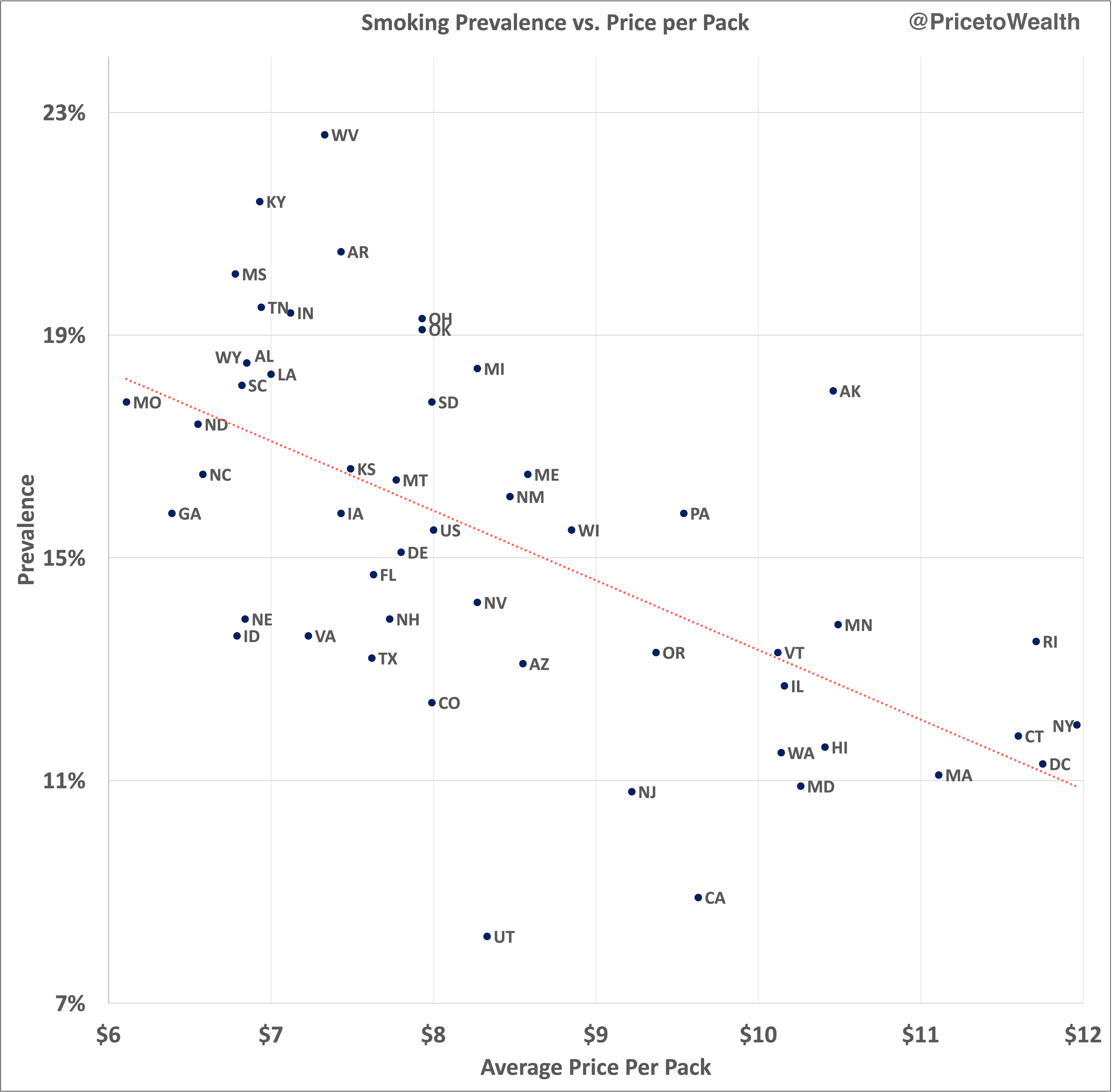 An explanation for California is less obvious. California’s price per pack is under $10 and the annual cost of smoking accounts for less than 3.5% of the median household income. In contrast, cigarettes in New York cost on average almost $12 per pack and the cost of smoking accounts for over 4.5% of the median household income. Despite these differences, California’s smoking rate is over three percentage points below New York’s. Perhaps Californians prefer more health-conscious lifestyles than New Yorkers do. Maybe New York’s weather makes New Yorkers want to smoke more despite the cost. Maybe the high price of a pack in New York has bestowed upon cigarettes a halo of luxury — smokers in Soho might “signal” to others that they can afford the hefty price tag. Maybe it’s just a cultural difference.