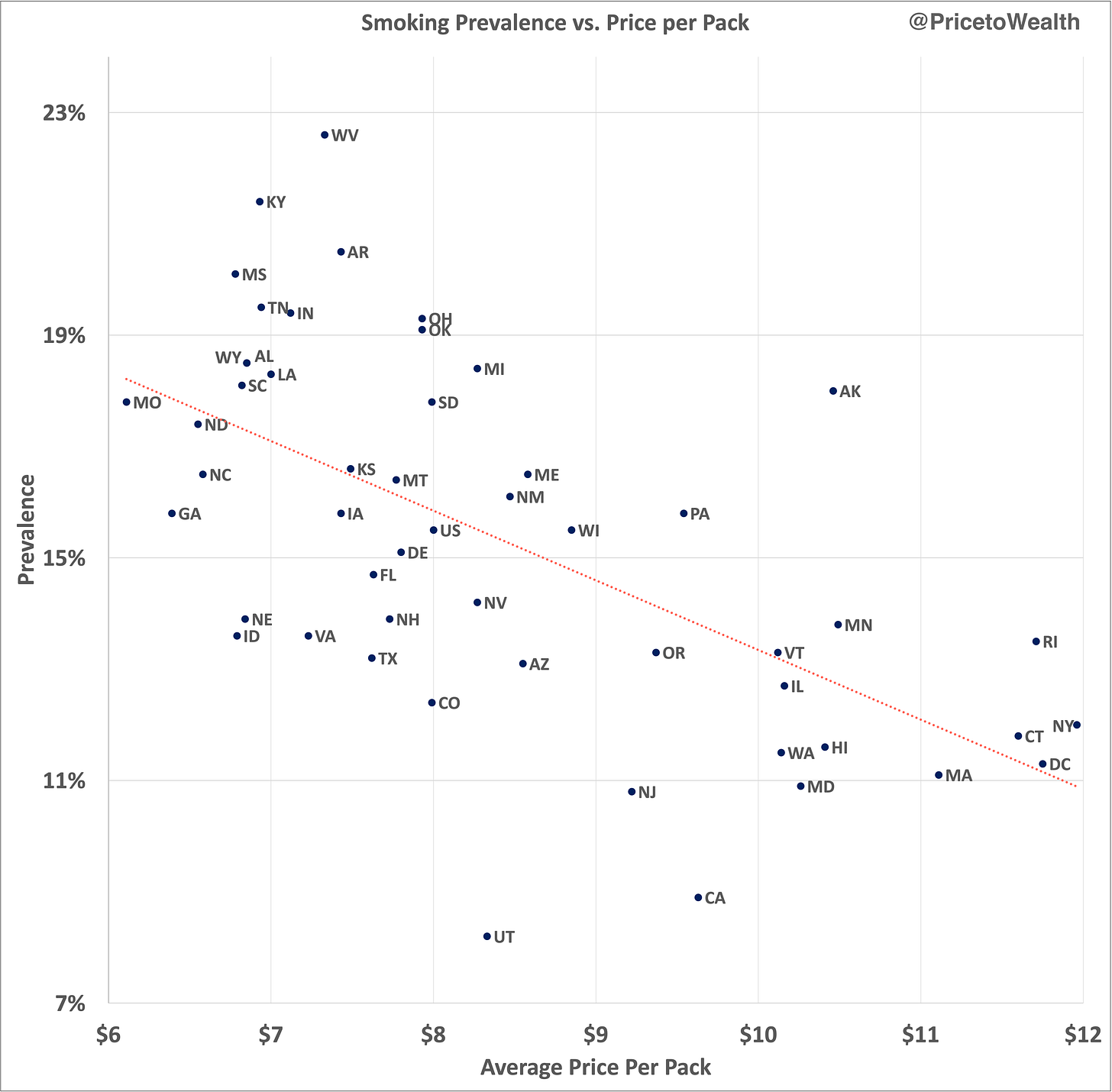 Generally, higher cigarette prices correlate with lower rates of smoking. As a product gets more expensive, consumer demand tends to decrease. While the addictive nature of cigarettes dampens the effect of high prices on demand, prevalence is certainly inversely correlated with price.
