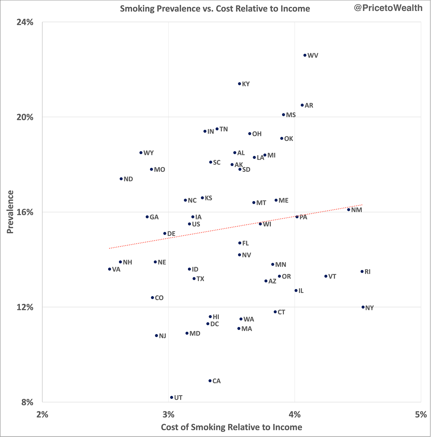 One answer is religion. Over 60% of Utah’s population is Mormon. The Church of the Latter Day Saints forbids its members from consuming tobacco, alcohol, coffee, marijuana, and other substances. So even though it is so much more affordable, in absolute and relative terms, to be a smoker in Utah than in New York, the religious makeup of Utah’s population has led to a sub-9% smoking rate there compared to New York’s rate of over 14%.