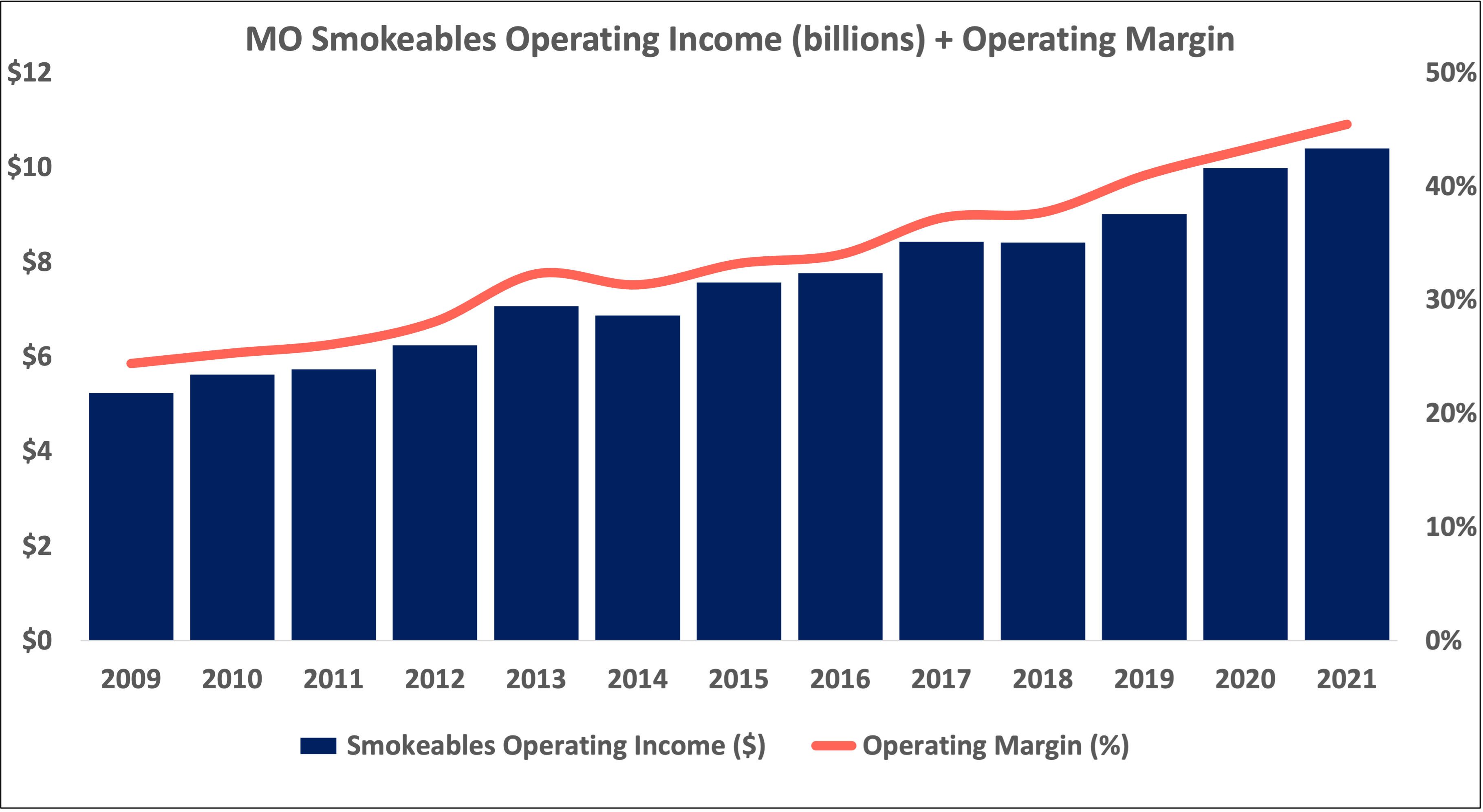 Thus, over the decades, despite millions of smokers smoking fewer sticks or quitting altogether, the demand from those who keep the habit has led to not just more revenue for Altria but more revenue at higher margins. Operating margins and operating profits from Altria’s smokeables segment have increased almost every year from 2009 to 2021.